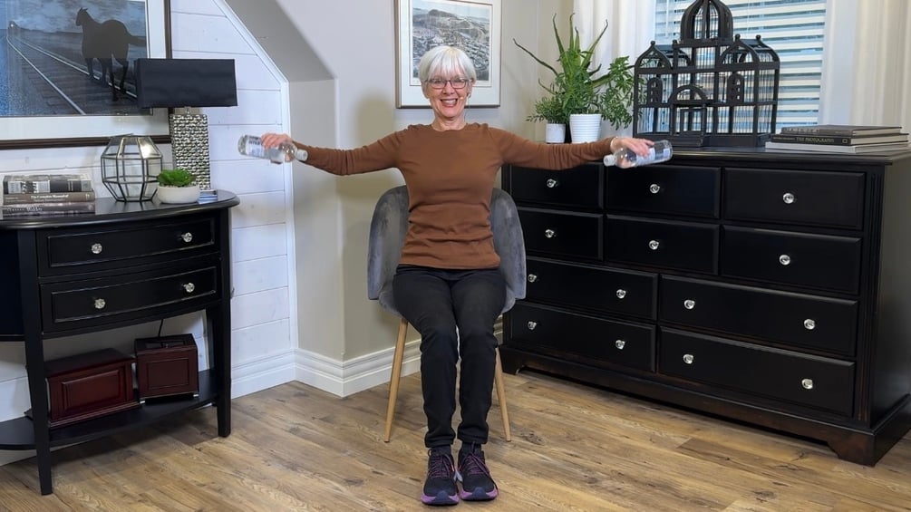 Video 3: Here I’m using water bottles as weights, but you can use any size hand weights that are right for you. There’s a gentle warm-up that leads to a great upper body workout. We will work the arms, shoulders, and back while we work on stabilizing your core muscles. This is an easy and fun way to tone your upper body.